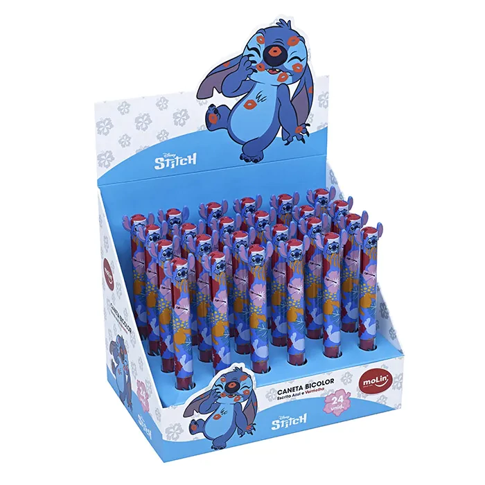 A Caneta Esferográfica 1.0mm Molin Bicolor Stitch proporciona uma escrita leve e consistente nas cores azul e vermelha.